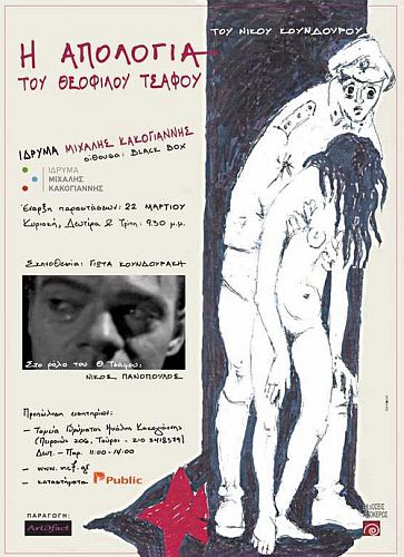 Το Τμήμα Πολιτισμού του ΣΥΝ θα παρακολουθήσει το έργο του Νίκου Κούνδουρου «Η απολογία του Θεόφιλου Τσάφου» στο Ίδρυμα Μιχ. Κακογιάννη, Πειραιώς 206 (τηλ. 210 3418550), την Κυριακή, 10.4.2011 και ώρα 8.30 μ.μ.